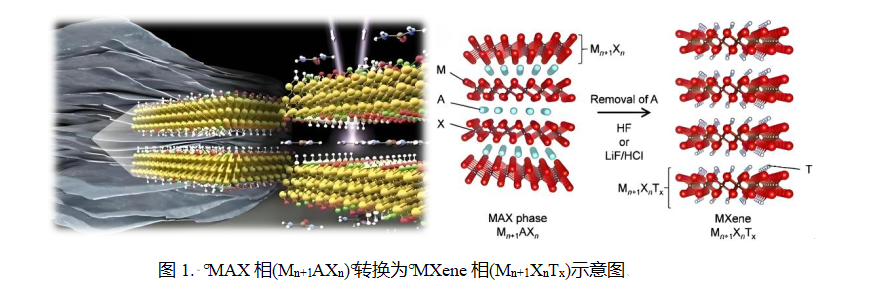 MXene材料是一类二维过渡金属碳氮化合物,化学式为Mn+1XnTm,其中,“M”代表过渡金属元素(主要为铬、钼、锰、铁、钴、铜、铝、银、镍、钯、铂和钌等元素),“X”代表碳和氮元素,“T”则代表材料表面的官能团(-OH、-F和-Cl等)。MXene是由MAX相(Mn+1AXn)通过刻蚀作用将A从MAX相中移除而得到,如图1所示。MXenes因其独特的二维层状结构、良好的导电性和优异的机械性能,自2011年首次被报导后就受到了研究者们的关注,已广泛应用于二次电池、超级电容器、电磁屏蔽、肿瘤治疗、生物传感器和光催化等领域。