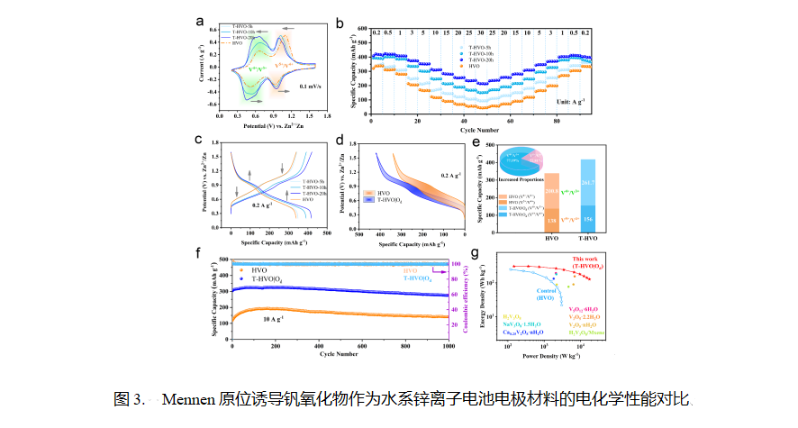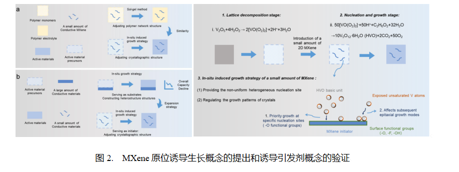 鉴于此,体育平台官网彭尚龙教授团队受到聚合物电解质工程的启发,提出了一种基于MXene材料的原位诱导生长策略。该策略通过在电极材料的成核和生长过程中引入少量的MXene,作为异质成核点和引发剂,调控阴极材料的晶体生长模式,实现了电化学性能的提升。而且,此方法具有一定的普遍意义,可推广到其它材料体系中。作为概念化的验证,以钒氧化物阴极为例,成功地调控了钒氧化物的形貌,并引入了缺陷。研究结果显示不仅在合成阶段直接引入了氧缺陷,而且避免了特定反应环境或容器的需求,实现了高安全性和高产量。通过这种方法得到的诱导钒氧化物表现出高的比容量和良好的倍率性能。此外,这项工作通过对Ti3C2MXene调控钒氧化物晶体生长模式相关机理的讨论,还揭示了MXene在晶体生长过程中的化学诱导机制与策略可行性,这将有助于深入理解、开发和推广MXene材料的原位诱导生长方法在二次电池领域的应用。
