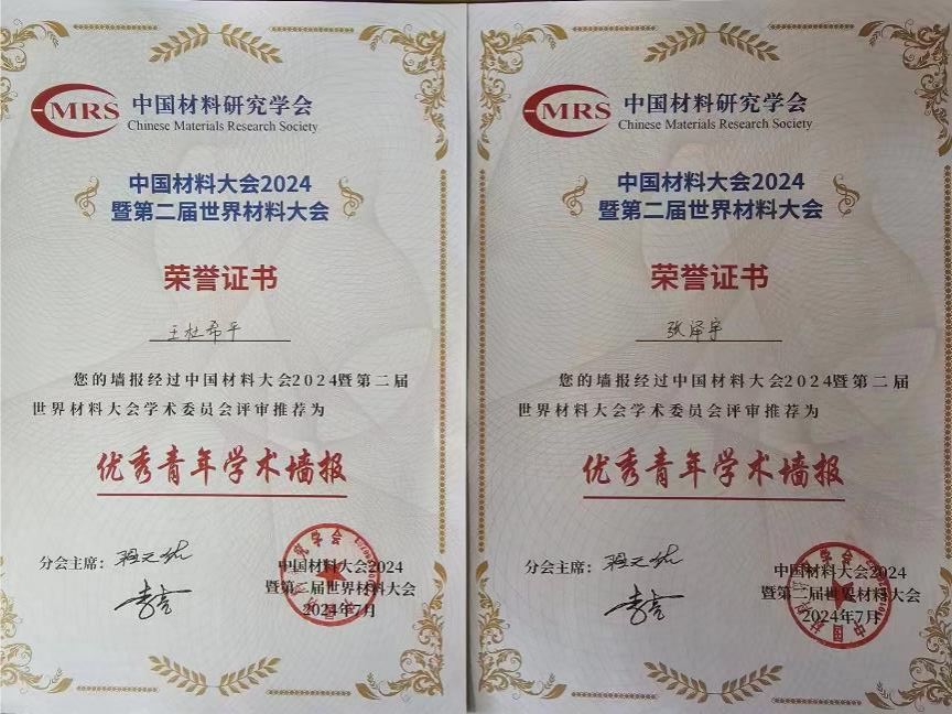 7月8日至7月11日,中国材料大会暨第二届世界材料大会在广州召开。“中国材料大会”是中国材料研究学会的学术年会,是重要的系列品牌会议之一。王育华教授课题组硕士生张泽宇和王杜希平参加本次会议,分别做了“番茄生长用SrMg0.5Zn0.5Al10O17红色发光材料的制备及性能研究”和“硅基太阳能电池用无机荧光粉研究”的墙报展示,两位同学均获得“优秀墙报奖”。
