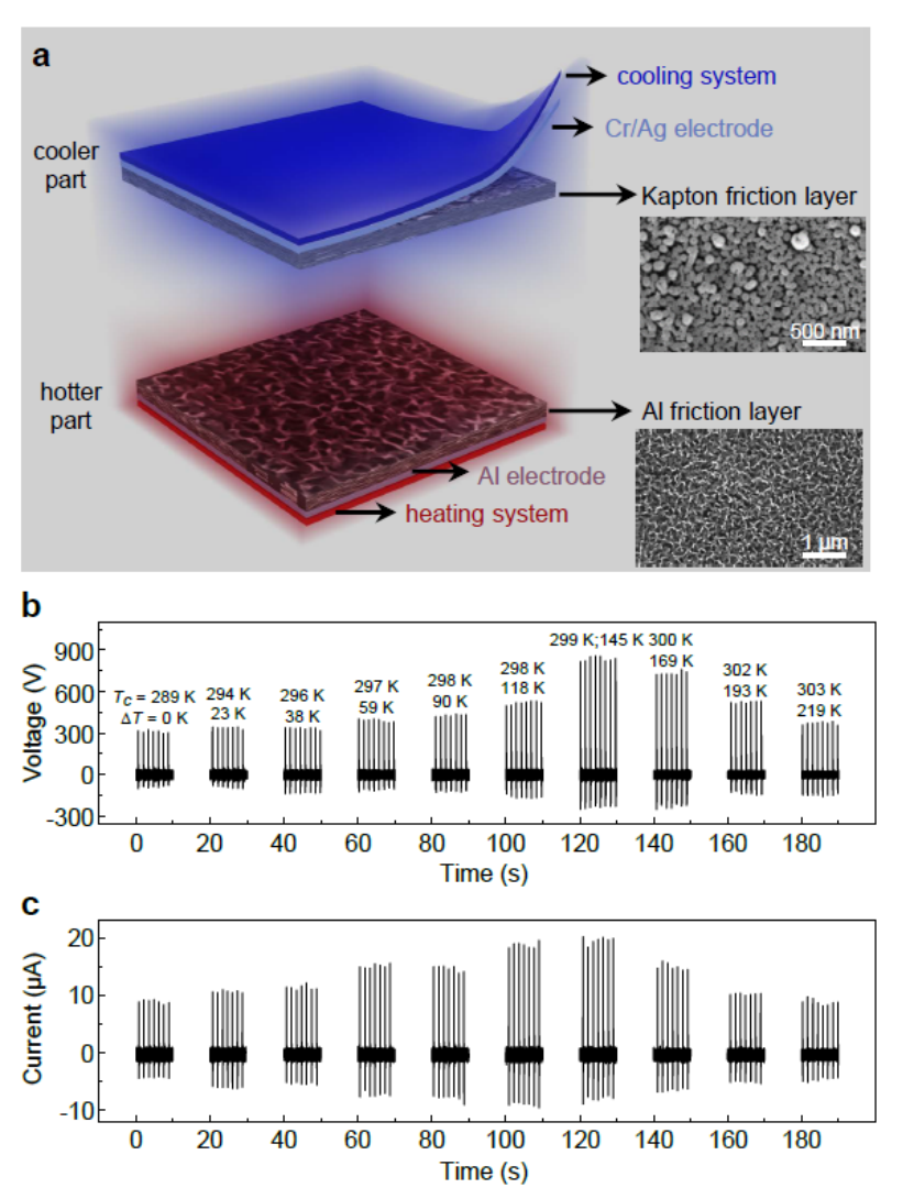 图1. 具有可控摩擦层温度的温差摩擦纳米发电机的设计与输出性能。a. 温差摩擦纳米发电机的示意图。插图分别为摩擦层Kapton与Al的表面微观形貌。b. 在不同温差下,温差摩擦纳米发电机的开路电压。c. 在不同温差下,温差摩擦纳米发电机的短路电流。